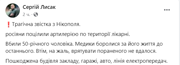 Сегодня российские войска ударили артиллерией по территории больницы в Никополе Днепропетровской области. Погиб мужчина.