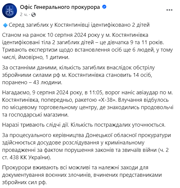 "По состоянию на утро 10 августа 2024 года в г. Константиновка идентифицированы тела 2 погибших детей – это девочки 9 и 11 лет. Продолжаются экспертизы по установлению лиц еще 6 человек, в том числе, вероятно, 1 ребенка", - говорится в сообщении.