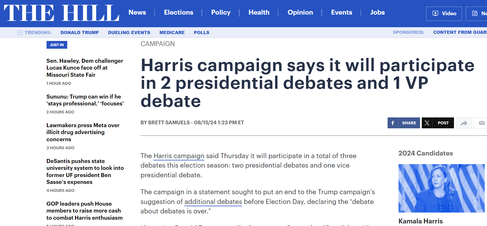Кандидат в президенты США от Демократической партии Камала Харрис примет участие в трех дебатах в этом предвыборном сезоне: двух президентских и одних вице-президентских.