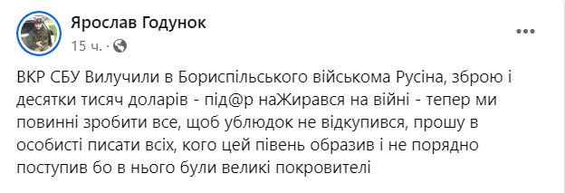 Экс-секретарь Бориспольского городского совета, а ныне боец ТрО Ярослав Годунок заявил, что у Русина якобы уже изъяли оружие и десятки тысяч долларов.