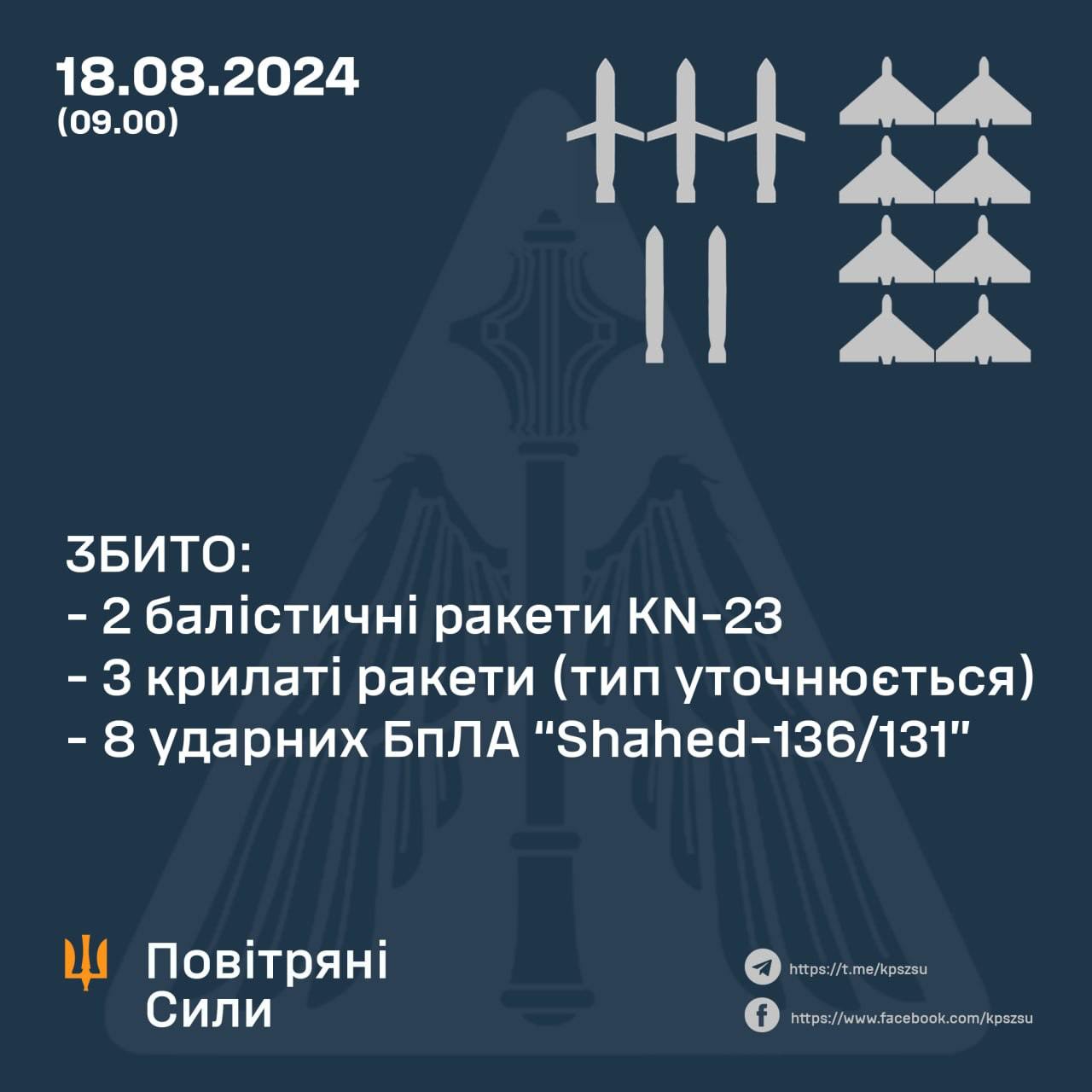 Сегодня ночью силами и средствами ПВО были сбиты пять из восьми ракет. А также все восемь "Шахедов", атаковавших Украину.