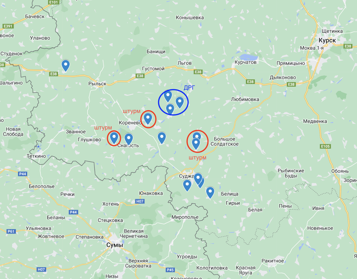 Комментируя ситуацию под Курском, российское минобороны сегодня заявило, что идет поиск украинских ДРГ южнее населенных пунктов Алексеевское, Сафоновка и Шептуховка (синий круг на карте). А штурмы отражались в направлении деревень Комаровка, Ольговка, Русское и Черкасское Поречное (красные круги на карте).