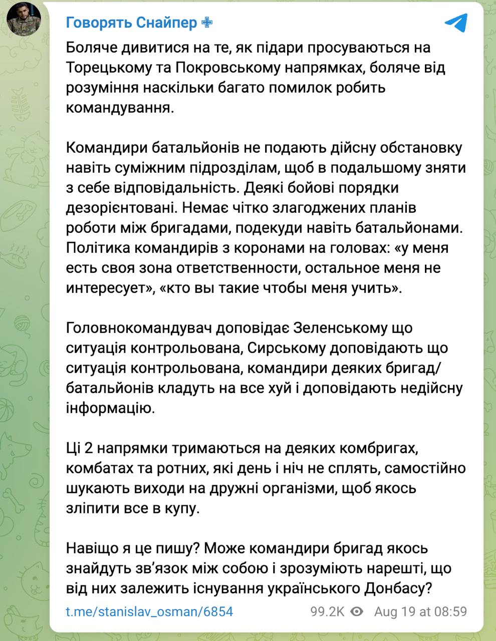По его информации, "командиры некоторых бригад/батальонов кладут на все х@й и докладывают недействительную информацию", дальше по цепочке главкому ВСУ Сырскому докладывают, что ситуация контролируемая, а он это докладывает Зеленскому.