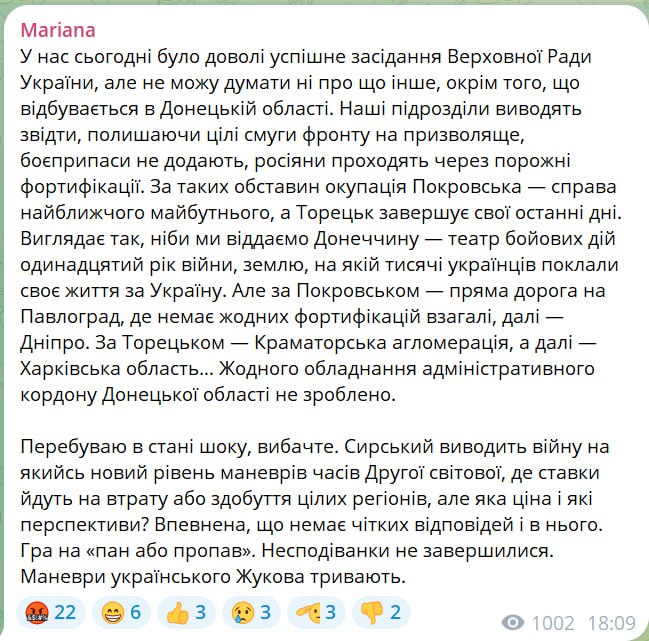 "Наши подразделения выводят оттуда, оставляя целые полосы фронта на произвол, боеприпасы не добавляют, россияне проходят через пустые фортификации. В таких обстоятельствах оккупация Покровская – дело ближайшего будущего, а Торецк завершает свои последние дни. Выглядит так, будто мы отдаем Донетчину", – написала она.