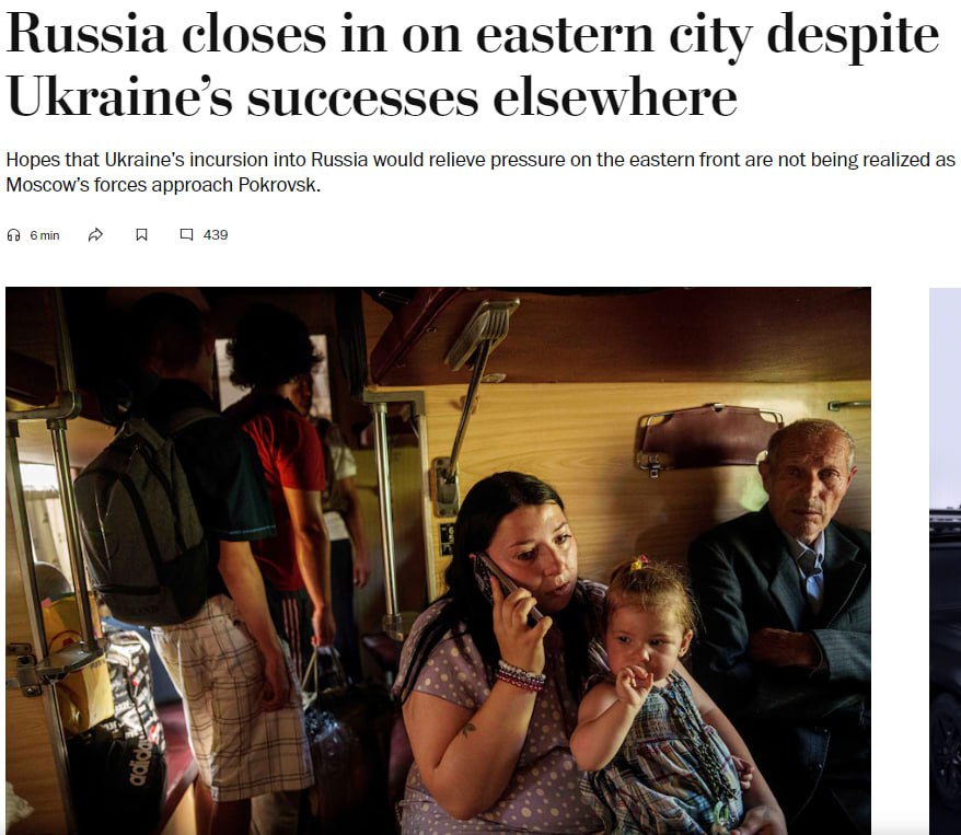 В то же время в статье с названием "Россия продвигается в Донецкой области, несмотря на успехи Украины в других местах" The Washington Post пишет, что успехи, достигнутые Украиной в ходе двухнедельного наступления на территорию России, не остановили продвижение российских войск в восточной части страны. Это привело к эвакуации Покровска.