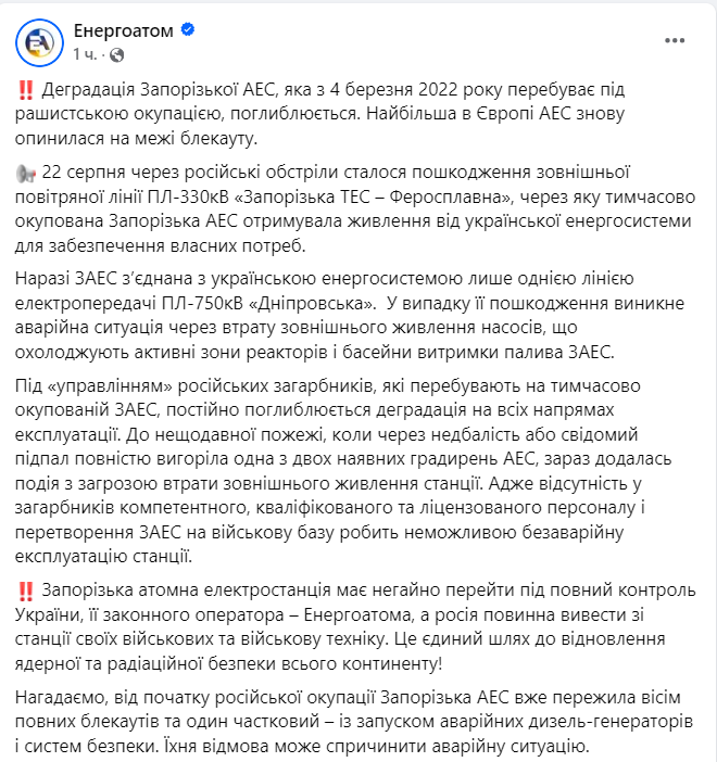 "22 августа из-за российских обстрелов произошло повреждение внешней воздушной линии ВЛ-330кВ "Запорожская ТЭС – Ферросплавная", из-за которой временно оккупированная Запорожская АЭС получала питание от украинской энергосистемы для обеспечения собственных нужд", - говорится в сообщении.