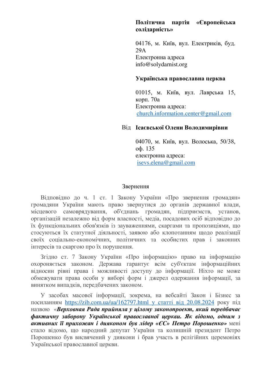 Адвокат Елена Исаевская подала запрос УПЦ с вопросом, был ли Порошенко рукоположен в диаконы церкви.