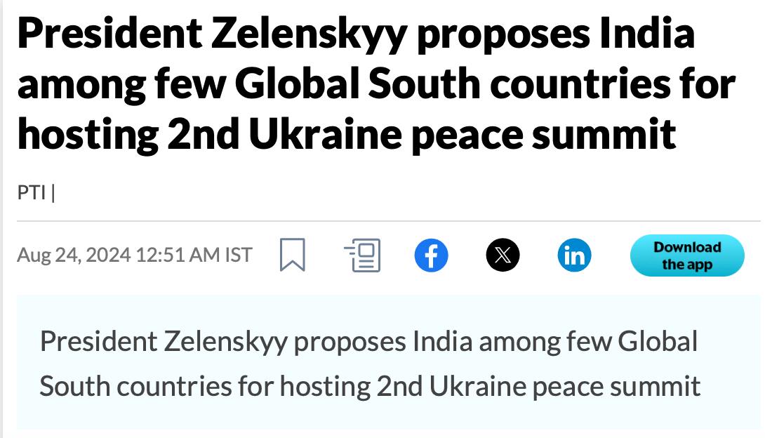 Призывая Индию подписать декларацию саммита мира в Швейцарии, президент Украины Владимир Зеленский предложил индийскому премьеру Нарендре Моди принять у себя следующий такой саммит.