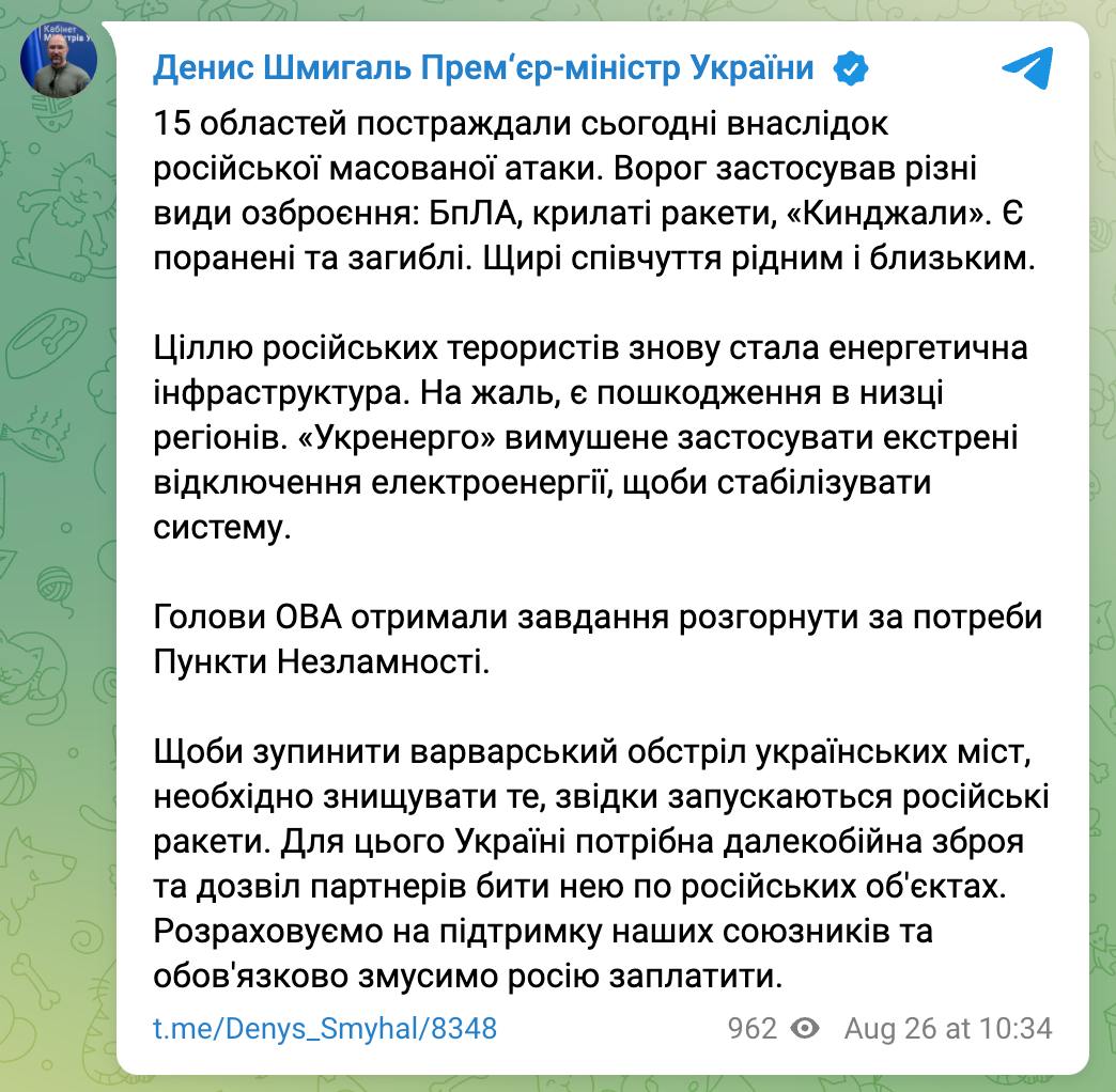 Премьер-министр Денис Шмыгаль сообщил, что в результате российской массированной атаки пострадали 15 областей.