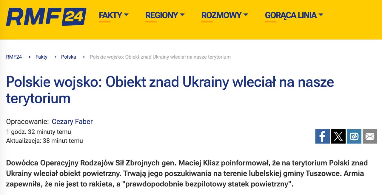 Оперативный командующий Вооруженными силами страны Мацей Клиш заявил, что воздушный объект залетел со стороны Червонограда в 6:43, его зафиксировали по меньшей мере три радиолокационные станции. В этом городе россияне уже несколько раз атаковали электростанцию.