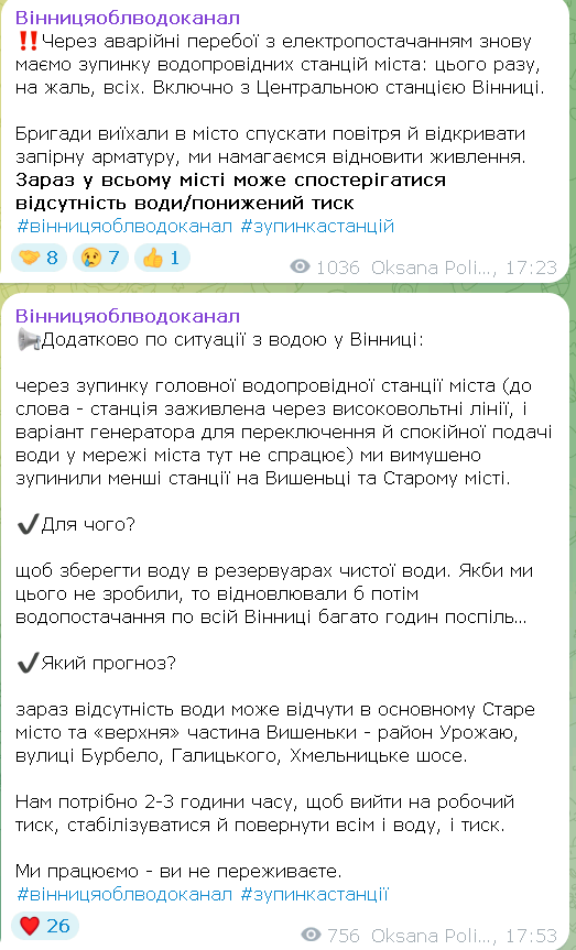 Также в водоканале отметили, что из-за остановки главной водопроводной станции города, которая запитана от высоковольтных линий, и поэтому невозможно использовать генератор для переключения и подачи воды в сети города, вынужденно были остановлены меньшие станции на Вишенке и в Старом городе. Это сделано, чтобы сохранить воду в резервуарах чистой воды.