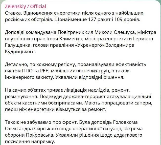 "Был доклад главкома Александра Сырского по поводу оперативной ситуации, в частности, обороны Покровска", – сказано в публикации.