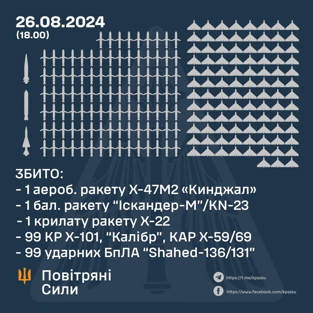 Из 127 ракет и 109 "Шахедов", запущенных сегодня войсками РФ по Украине, было сбито 102 ракеты и 99 дронов.