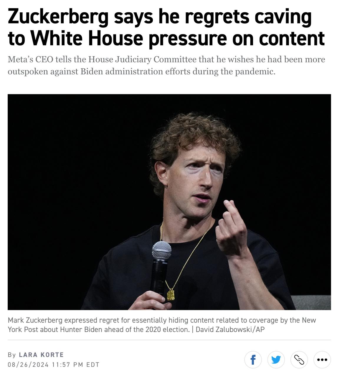 Цукерберг заявил, что его компания Meta подчинилась давлению администрации Байдена и подвергла цензуре контент в соцсетях
