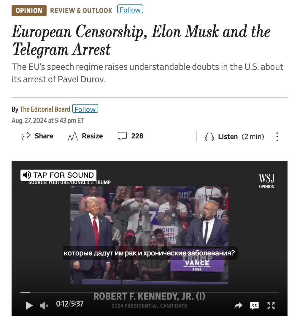Также издание отдельно выпустило редакционную колонку на тему задержания Павла Дурова. В ней говорится о "проблеме цензуры в Европе", что "вызывает понятные сомнения в США по поводу ареста Павла Дурова".