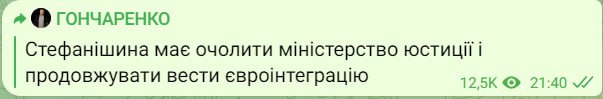 Стефанишина должна возглавить Министерство юстиции и продолжать вести евроинтеграцию, написал в своем телеграм-канале нардеп Алексей Гончаренко.