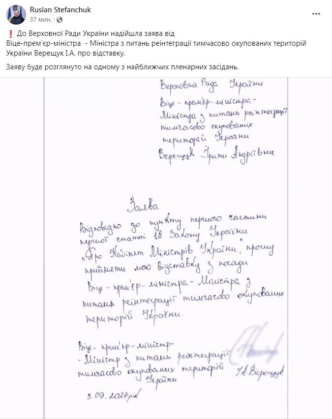 Также Стефанчук сообщил, что в Раду поступило заявление об отставке и от вице-премьер-министра – министра по вопросам реинтеграции временно оккупированных территорий Ирины Верещук.