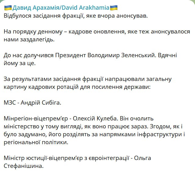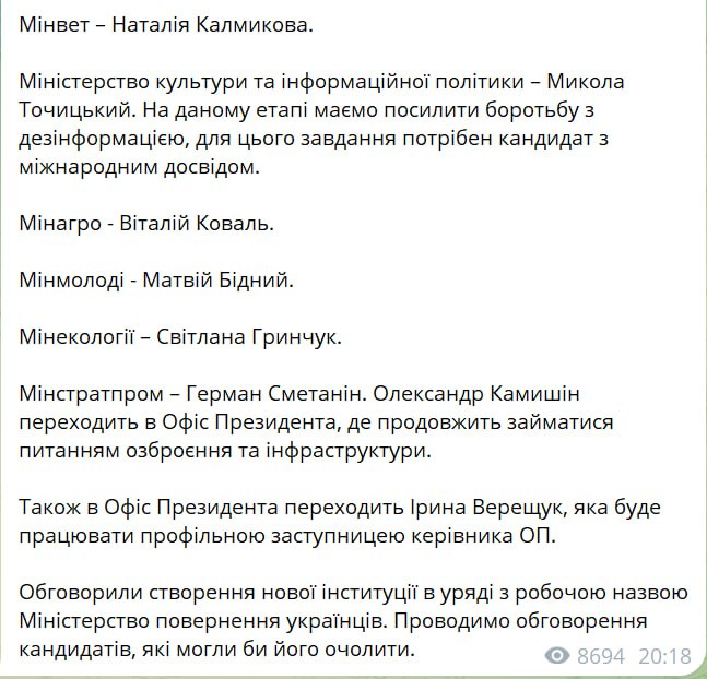 Вскоре глава фракции "Слуги народа" Давид Арахамия в своем телеграм-канале подтвердил информацию о кандидатурах новых министров.  Также он написал, что бывший министр стратегических отраслей промышленности Александр Камышин переходит на работу в Офис президента.