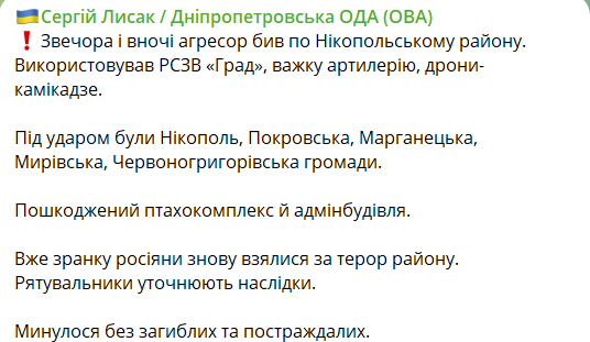 "Под ударом были Никополь, Покровская, Марганецкая, Мировская, Красногригорьевская громады. Поврежден птицекомплекс и админздание", - написал он.
