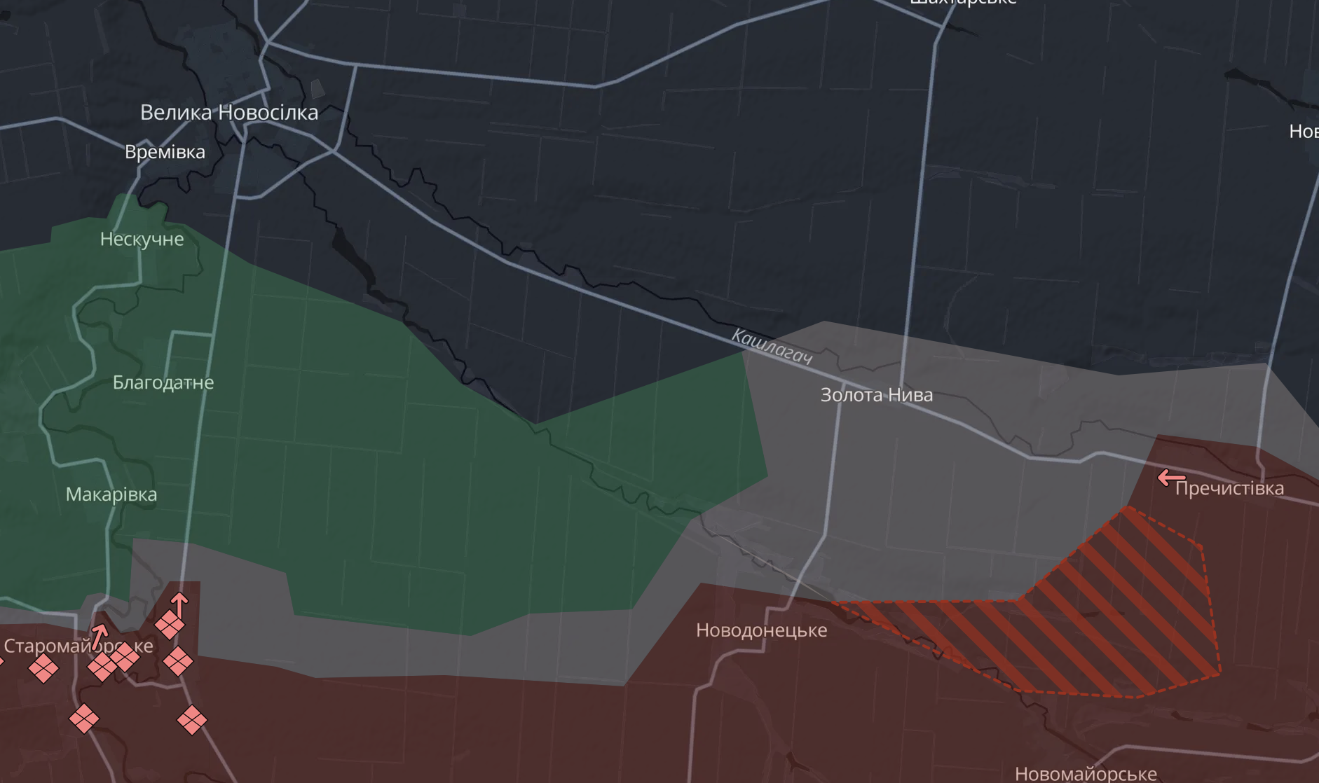 К западу от Угледара они после захвата Пречистовки штурмуют село Золотая Нива. Оно, судя по карте Deep State, перешло в "серую зону".