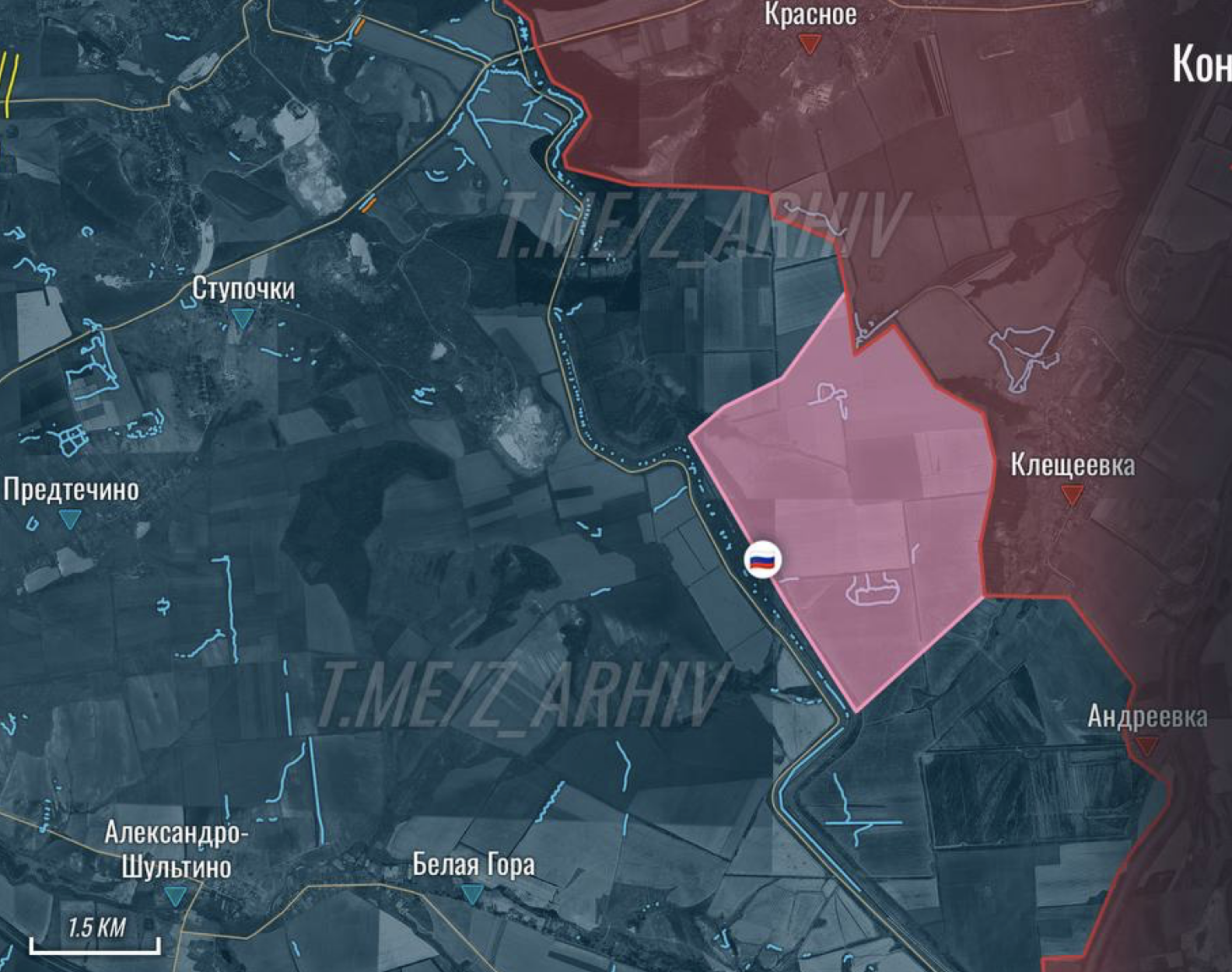 Российские телеграм-каналы утверждают, что россияне сегодня прорвали оборону ВСУ севернее этого участка - под Клещеевкой. И, как заявляется, вышли на восточный берег канал Северский Донец - Донбасс, сделав рывок на три километра и заняв заодно расположенные там господствующие высоты.
