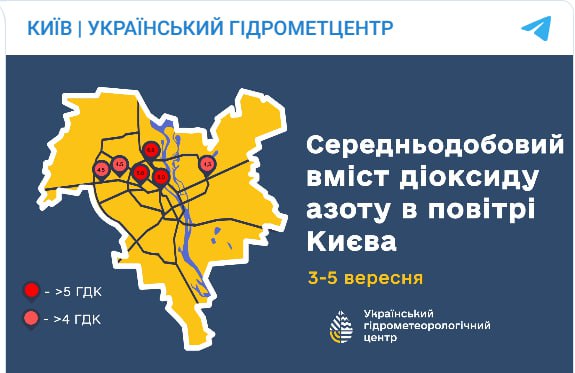 Метеорологи фиксируют, что в течение 3-5 сентября уровень загрязнения диоксидом азота достиг 5-8 среднесуточных предельно допустимых концентраций в районах: Бессарабской, Галицкой площадей, улиц Довженко, Каунасской, Скляренко, Берестейского проспекта.