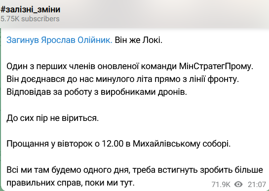 28-летний Олейник занимался на фронте дронами, тем же направлением он занимался и в министерстве.
