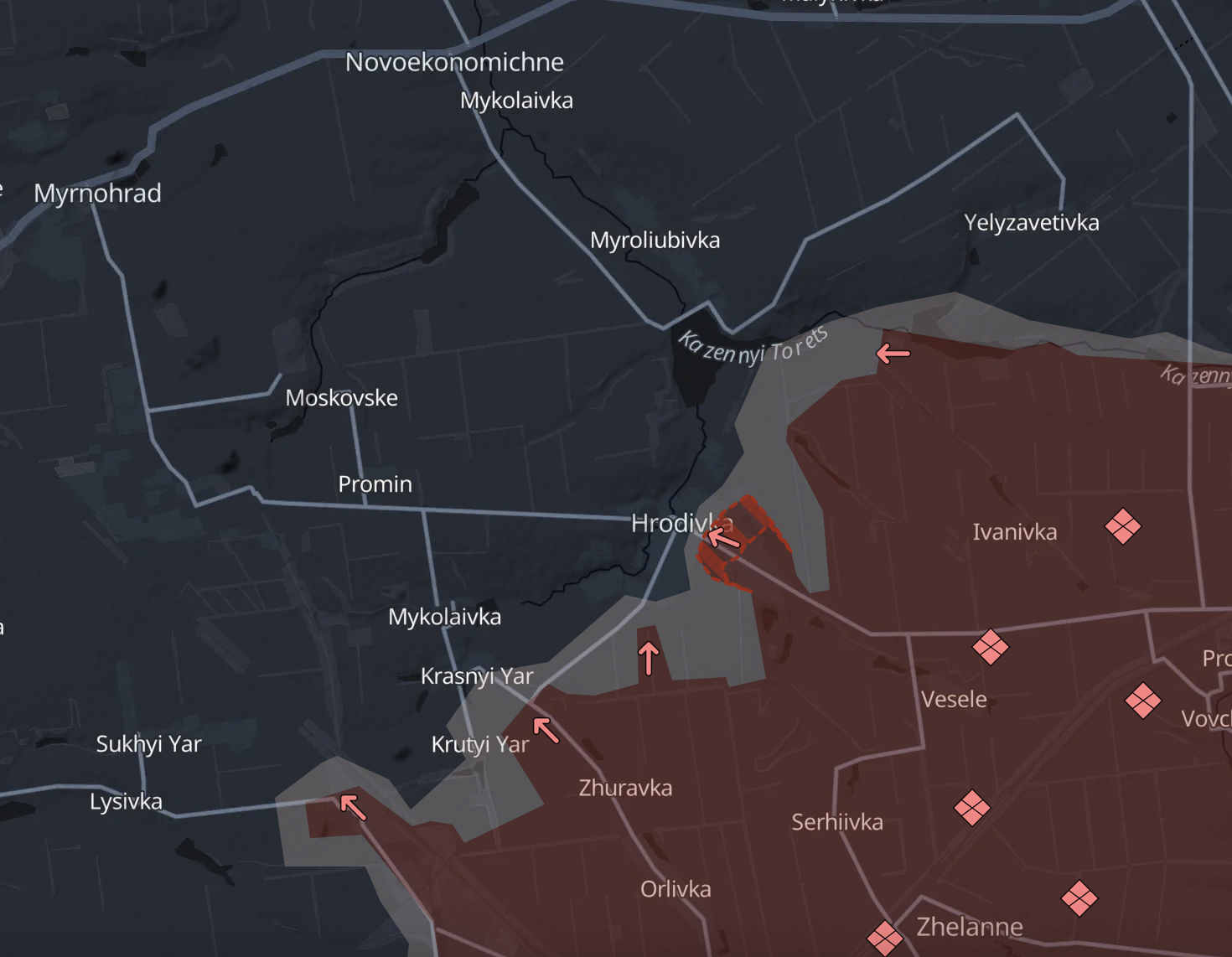 На Покровском направлении россияне, по данным Deep State, продвинулись в Гродовке, заняв примерно треть населенного пункта, из которого ведет дорога на Мирноград.