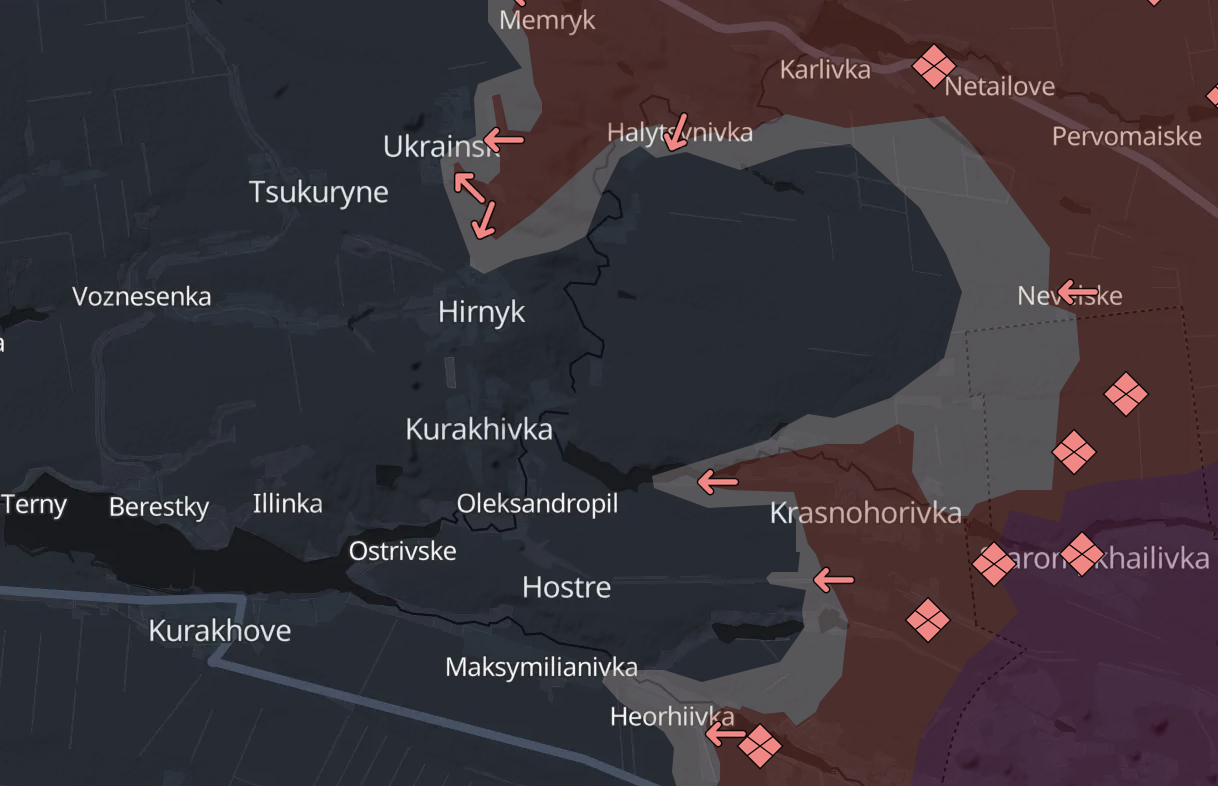 При этом на южном фланге Покровского выступа российские войска продолжают атаковать в сторону Курахово - ведут штурм Украинска и бои на подступах к Горняку.