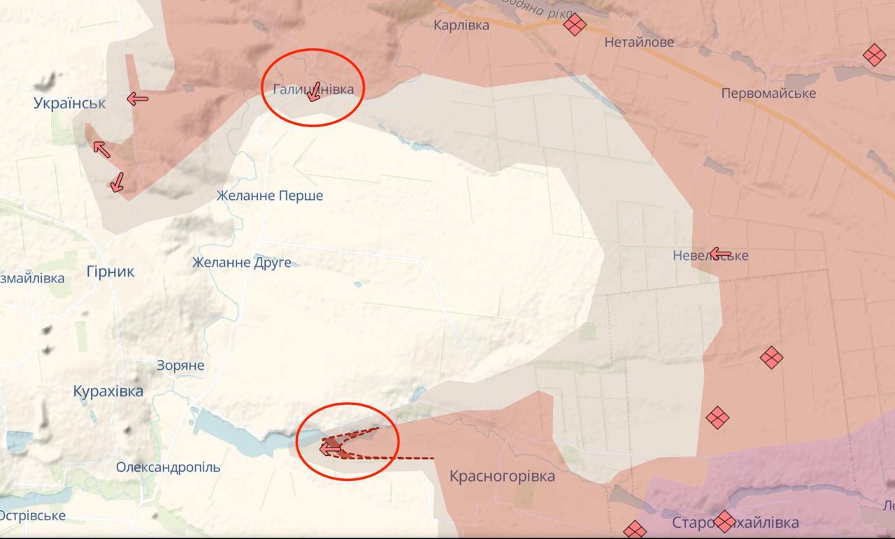 Галицыновка находится на Покровском направлении, юго-западнее Карловки. На карте Deep State указано, что ВСУ удерживают небольшую часть села на окраине.