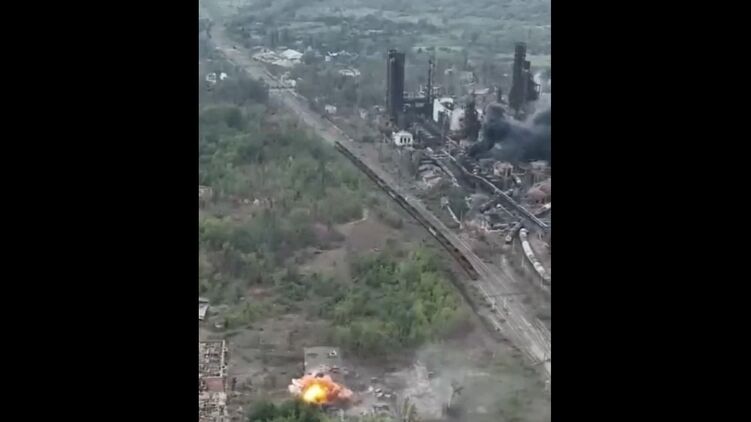 Сообщается, что городе идут бои. Судя по кадрам, удары наносятся по промзоне и прилегающим кварталам. Видны железнодорожные рельсы и стоя́щие на на них составы.