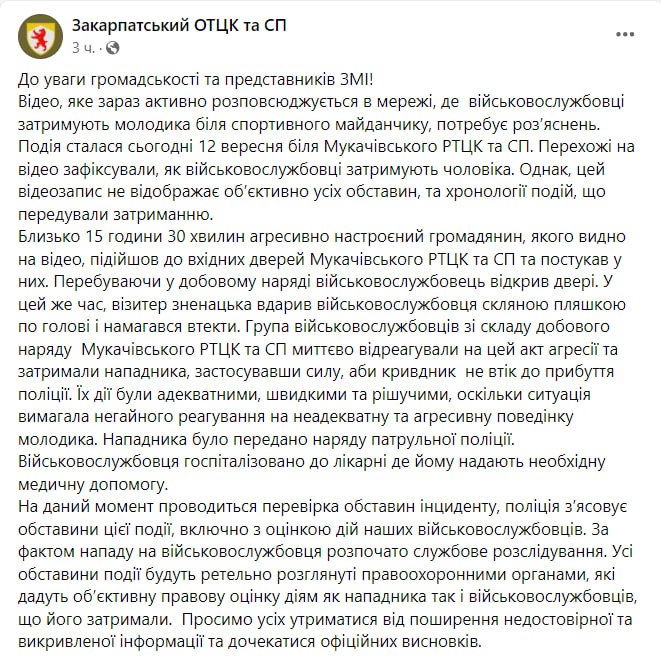 При этом утверждается, что мужчина сам "подошел к входной двери Мукачевского РТЦК и СП и постучал в нее. Находясь в посуточном наряде военнослужащий открыл дверь. В это же время визитер неожиданно ударил военнослужащего стеклянной бутылкой по голове и пытался скрыться. Группа военнослужащих из состава суточного наряда Мукачевского РТЦК и СП мгновенно отреагировала на этот акт агрессии и задержали нападающего, применив силу, чтобы обидчик не скрылся до прибытия полиции".