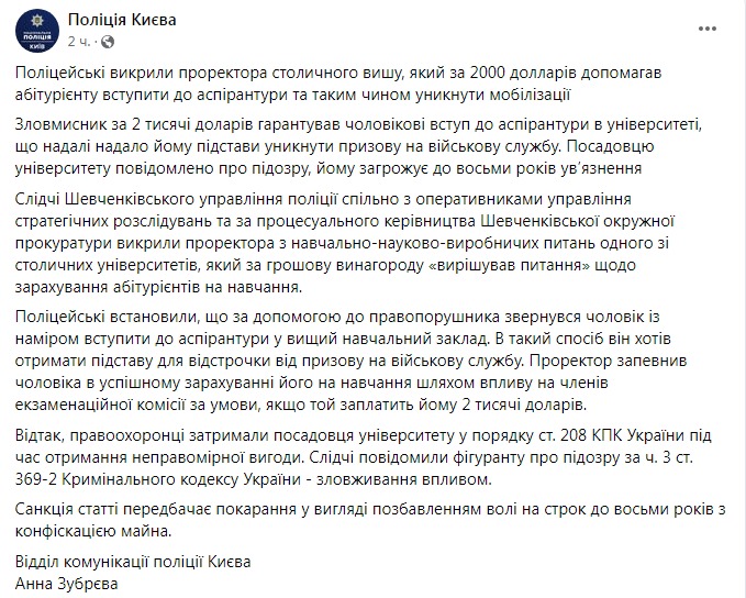 В публикации полиции не указано имя фигуранта, однако телеграм-каналы пишут, что речь идет о проректоре о Национального университета биоресурсов и природопользования.