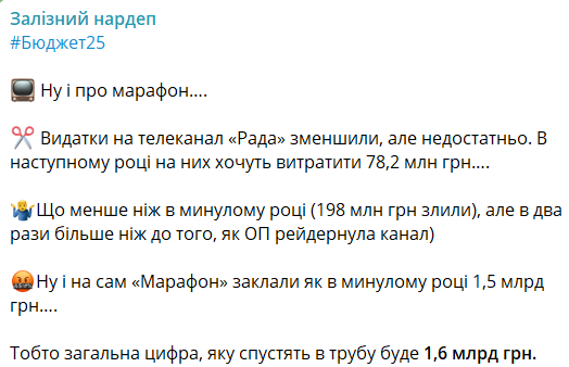 При этом расходы на телемарафон заложили, как и в нынешнем году на уровне 1,5 млрд грн.