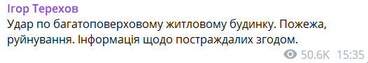 "Удар по многоэтажному жилому дому. Пожар, разрушение. Информация о пострадавших впоследствии", - написал он.