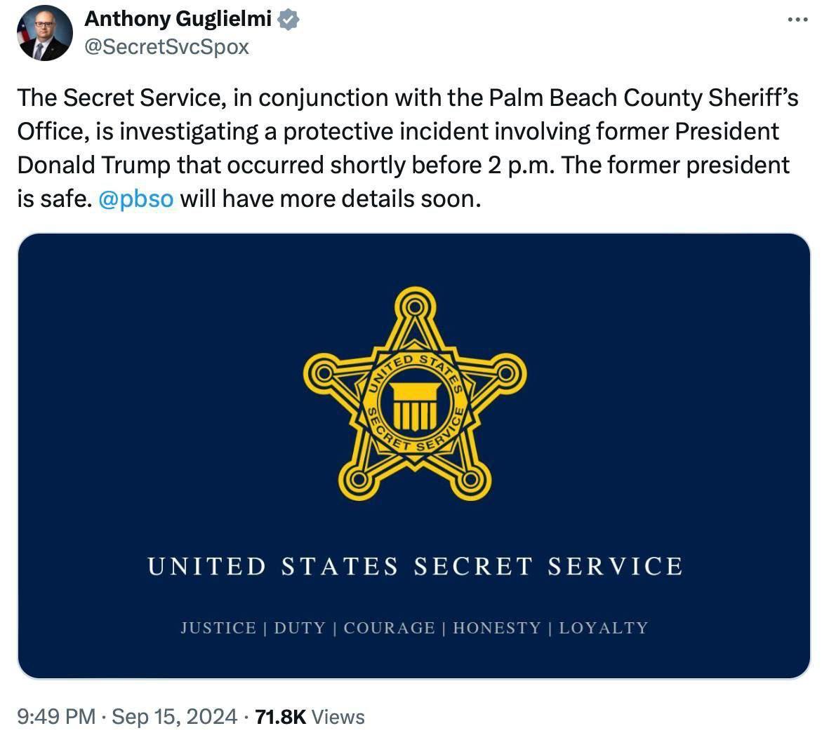 Секретная служба США, которая охраняет Трампа, заявила, что разбирается в инциденте. Об этом написал ее пресс-секретарь в соцсети Х.
