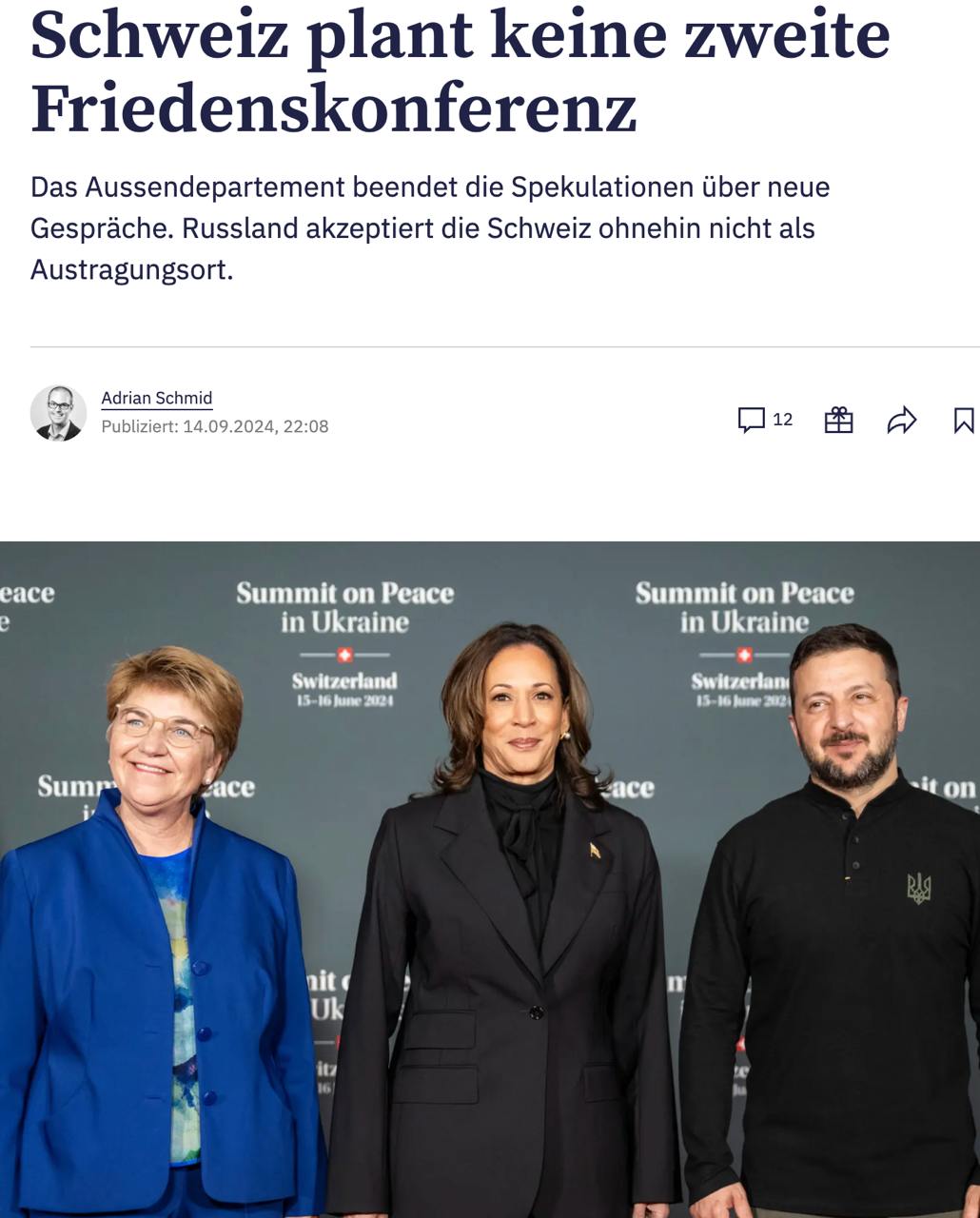 11:33 Швейцария не планирует проведение второй мирной конференции по Украине, сообщил МИД страны местной газете Tages-Anzeiger.