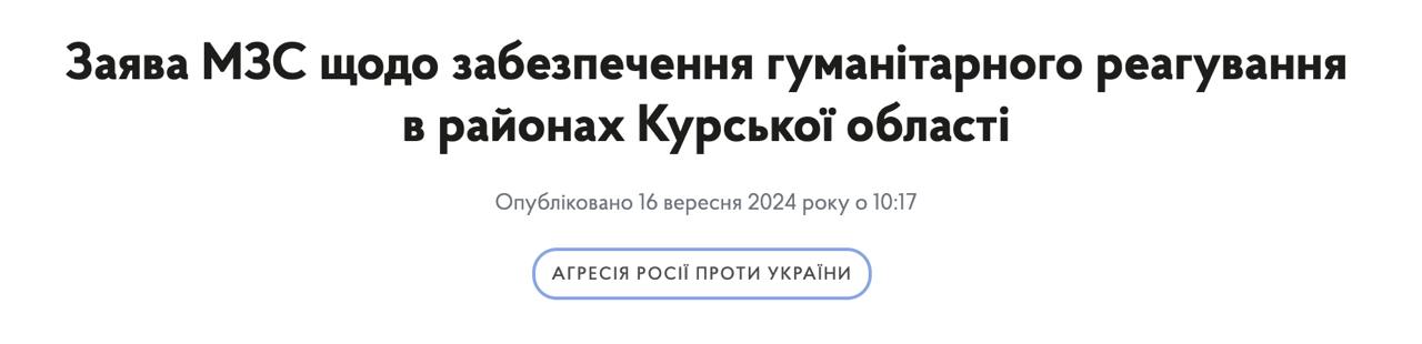 "Гражданские жители на территории Курской области получали и получают гуманитарную помощь. Министерство иностранных дел Украины обратилось в Организацию Объединенных Наций присоединиться к мерам гуманитарного реагирования на указанной территории и направило ООН соответствующую ноту", - говорится в сообщении.