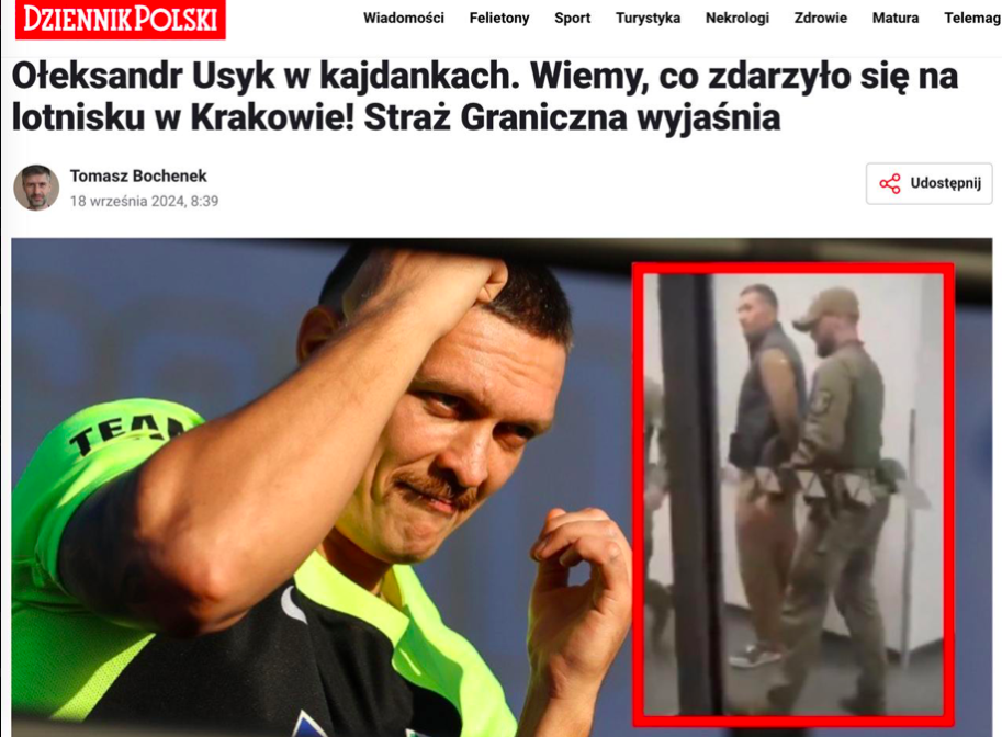 Польские пограничники сообщили, что не задерживали Усика в аэропорту Кракова, передает Dziennik Polski.