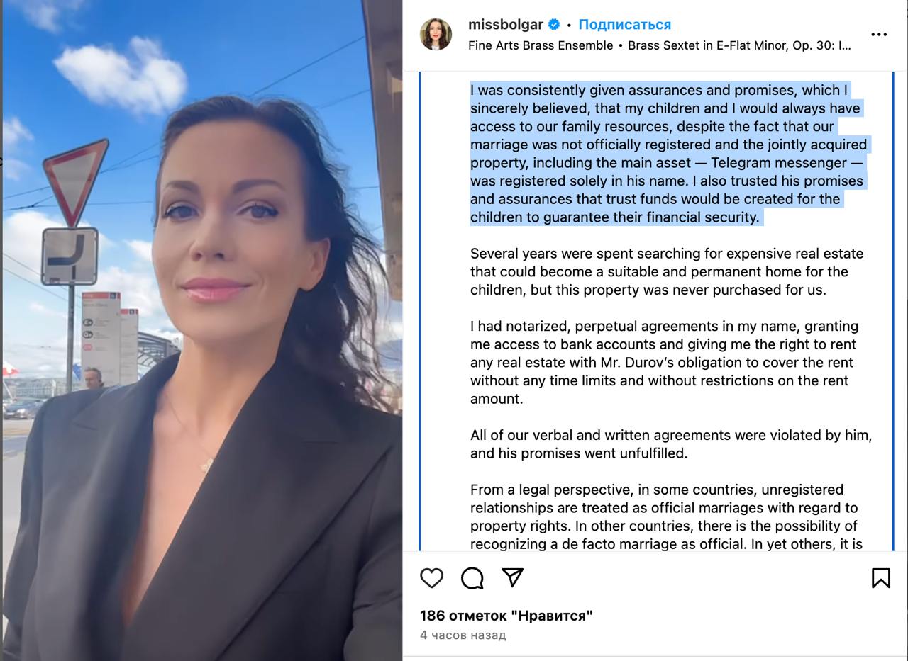 Ирина Болгар, мать троих детей Павла Дурова, заявила о своих правах на Telegram. Об этом она написала в своей странице в Instagram.
