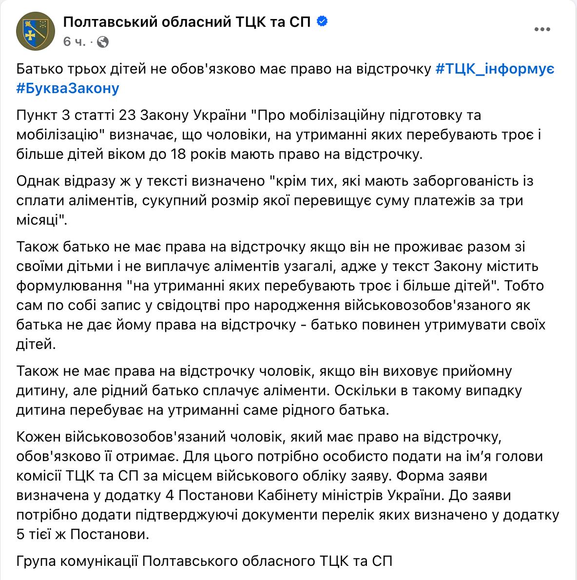 Отец троих детей не обязательно имеет право на отсрочку. Об этом сообщает Полтавский ТЦК.