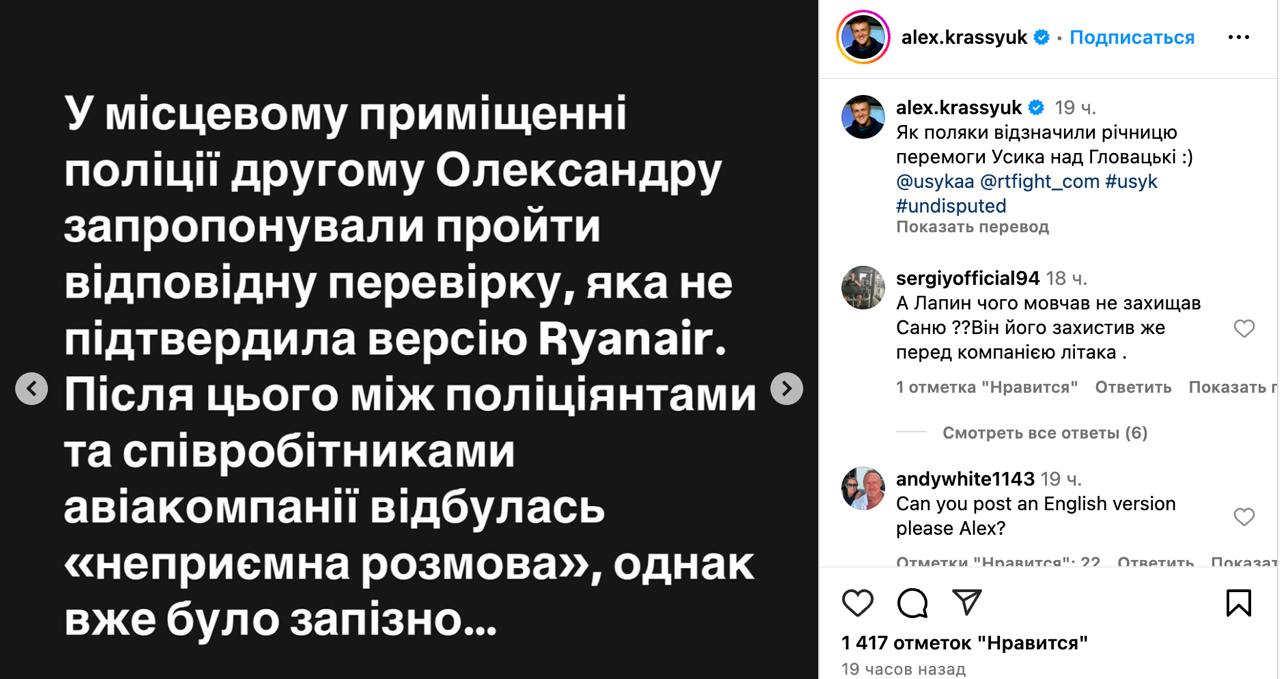 Соответствующий пост Красюк опубликовал в Инстаграме.