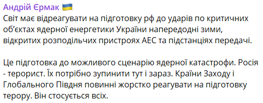 Глава Офиса президента Андрей Ермак добавил, что "это подготовка к возможному сценарию ядерной катастрофы".