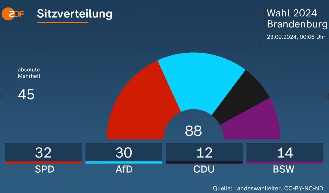 Напомним, накануне правящая СДПГ лидировала в земле Бранденбург с отрывом от АдГ всего в один процент.