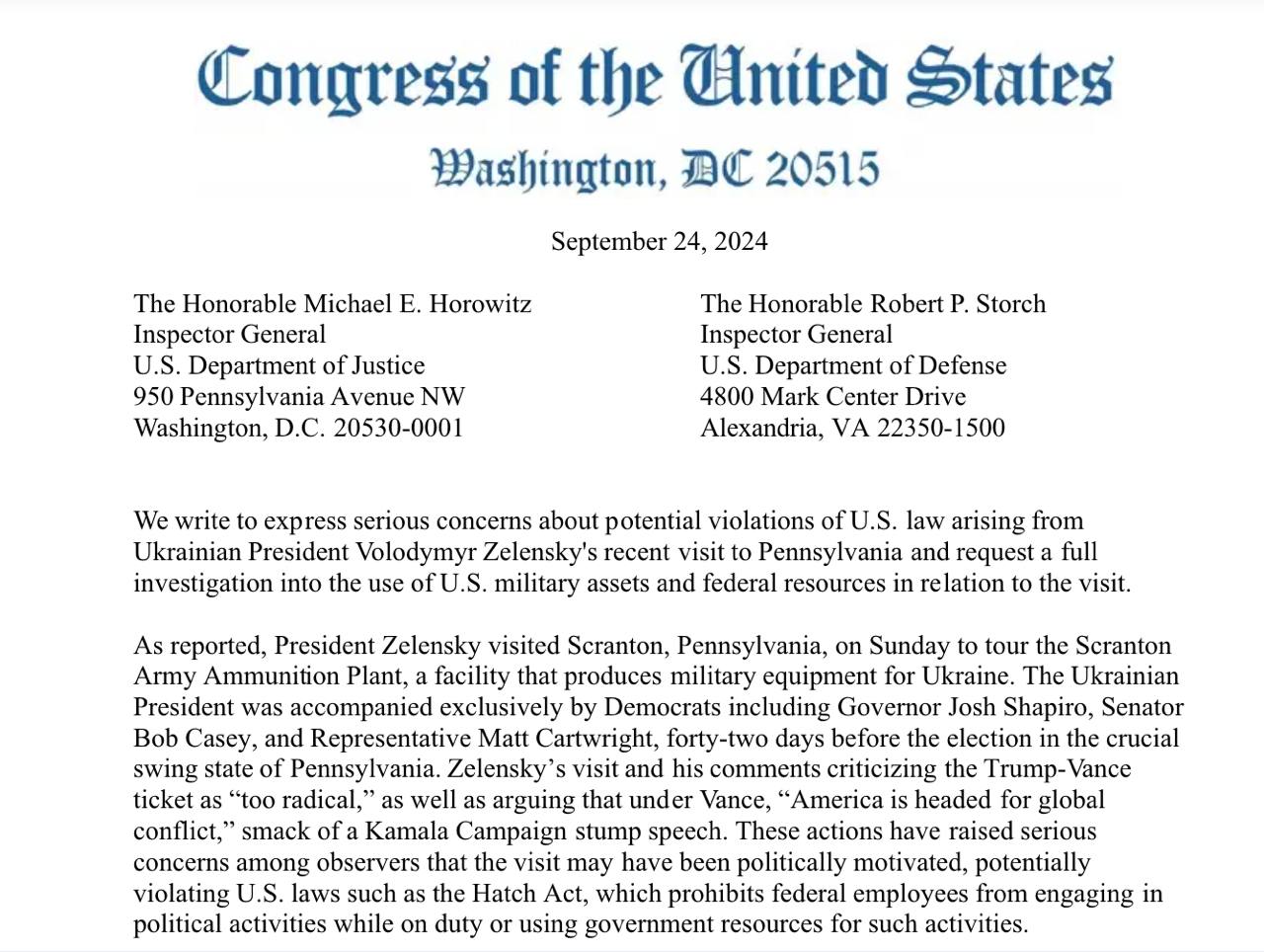 Группа из девяти республиканцев во главе с Лэнсом Гуденом (Техас) запросила информацию из министерств юстиции и обороны, чтобы определить, была ли поездка Зеленского в Пенсильванию в начале этой недели "политически мотивированной" и оплаченной средствами США. В частности, авторы запроса интересуются, доставляли ли Зеленского в Пенсильванию на американском военном самолете и находился ли он под защитой Секретной службы. Также они спросили, почему президента Украины сопровождали только демократы.