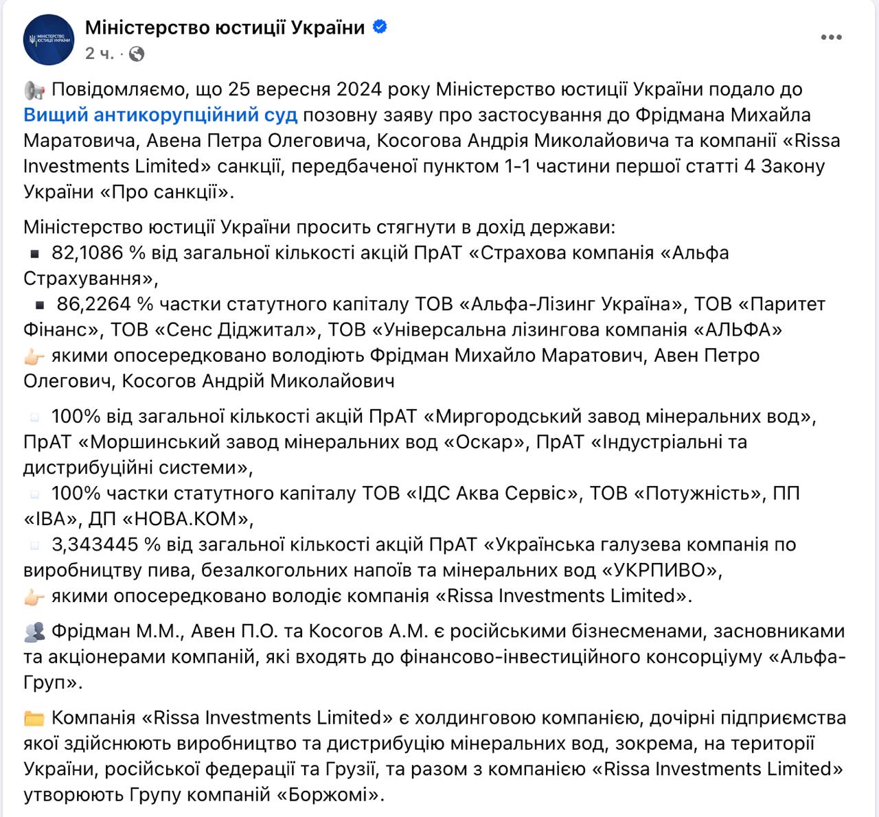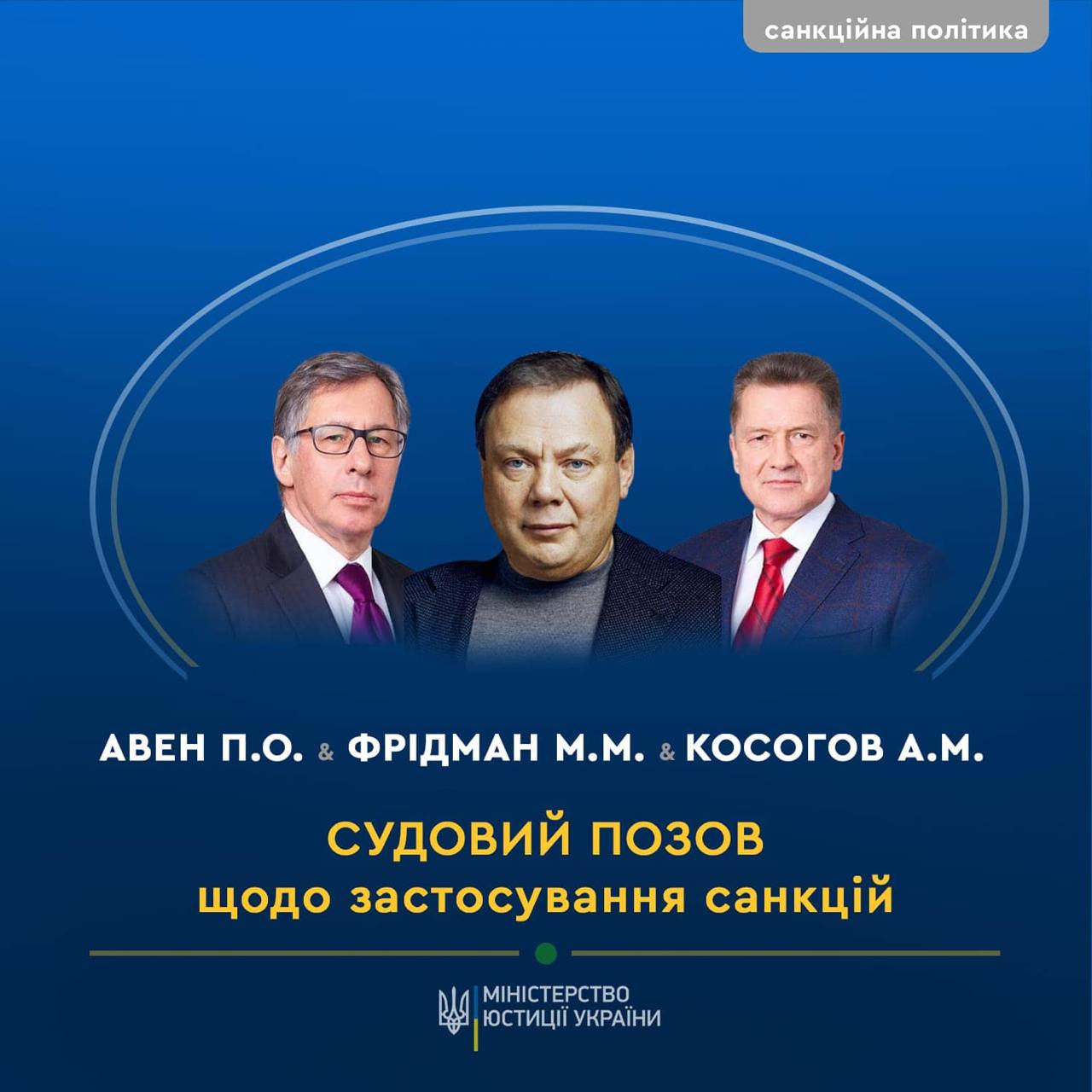Минюст попросил Высший антикоррупционный суд взыскать в доход государства украинские активы российских бизнесменов. Кроме Фридмана, это также Петр Авен и Андрей Косогов. Речь идет о следующих предприятиях:
