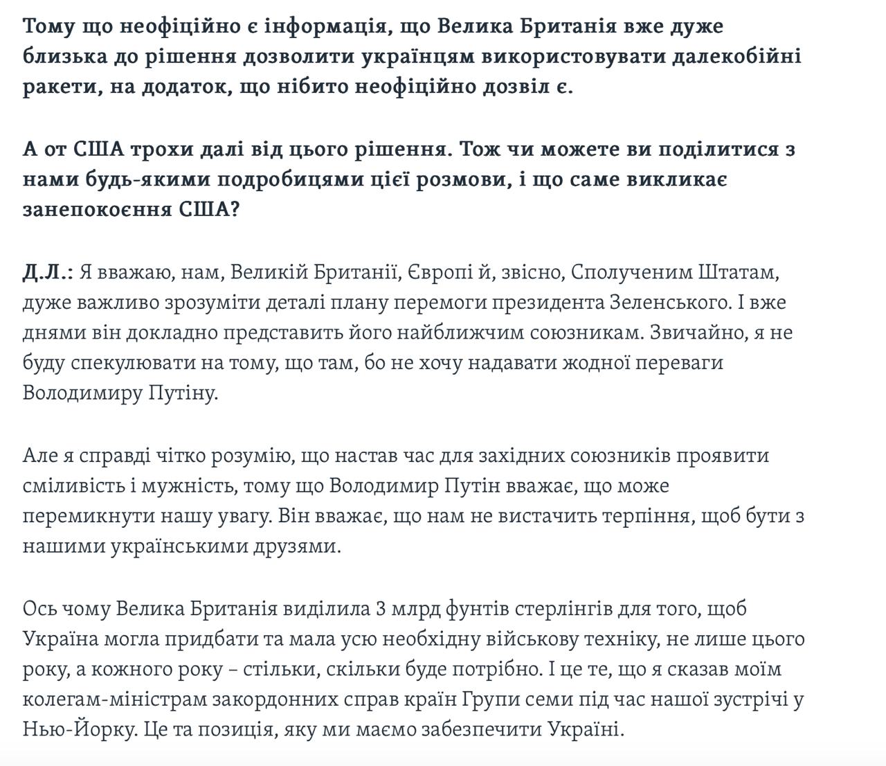 Министр иностранных дел Британии Дэвид Лэмми в интервью "Голосу Америки" не ответил прямо на вопрос, получит ли Украина разрешение на дальнобойные удары по РФ.