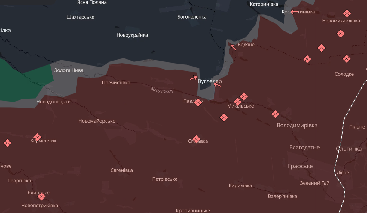 На карте DeepState восточная часть города отмечена как серая зона. Также отмечено продвижение россиян по флангам к северу от Угледара.