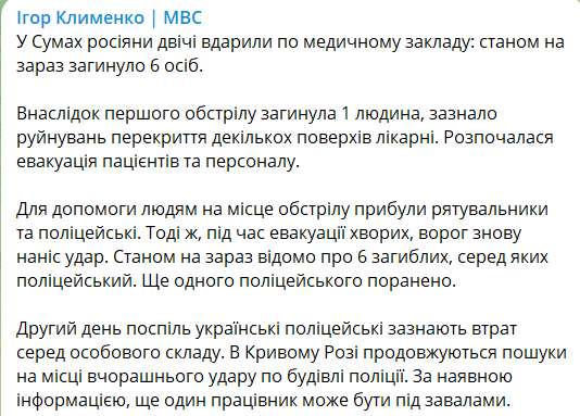 09:24 В Сумах погибли шесть человек после двух ударов по медучреждению, заявил глава МВД Игорь Клименко.
