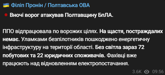 10:04 Ночью россияне атаковали Полтавскую область ударными беспилотниками. Обломками "Шахедов" повреждена энергетическая инфраструктура на территории области.